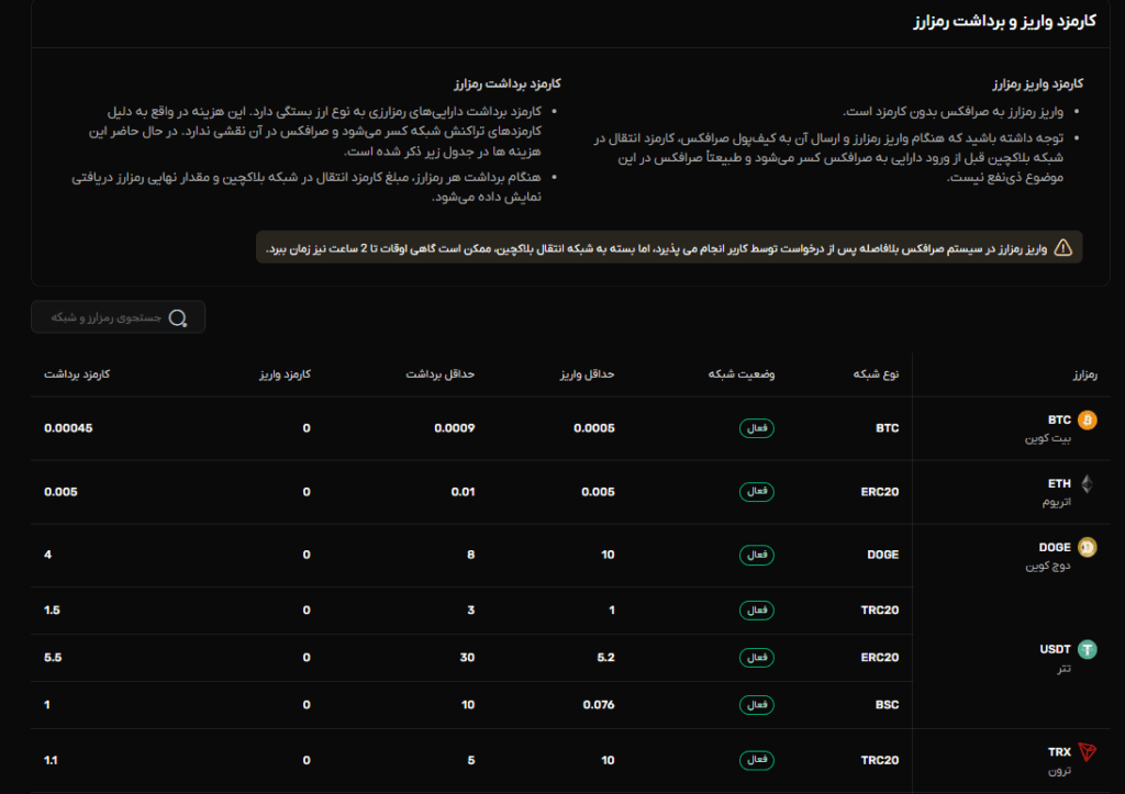 در صرافکس، برای سهولت کاربران، واریز و برداشت اکثر رمزارزها بهصورت اتوماتیک، سریع و بر بستر بلاکچین اصلی آن رمزارز انجام میشود. در این بخش به جزئیات مربوط به کارمزد، حداقل برداشت، شبکه انتقال و وضعیت فعلی شبکه هر رمزارز پرداخته شده است.